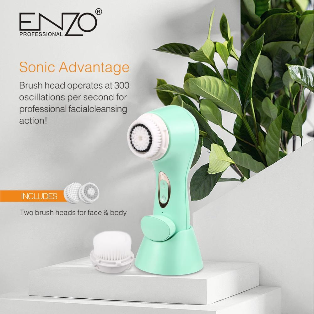 Appareil de nettoyage de la peau Enzo avec base de chargement sans fil .La tête de brosse à fonction sonique fonctionne à 300 oscillations par seconde pour un nettoyage professionnel du visage . Cette appareil de nettoyage de la peau ENZO