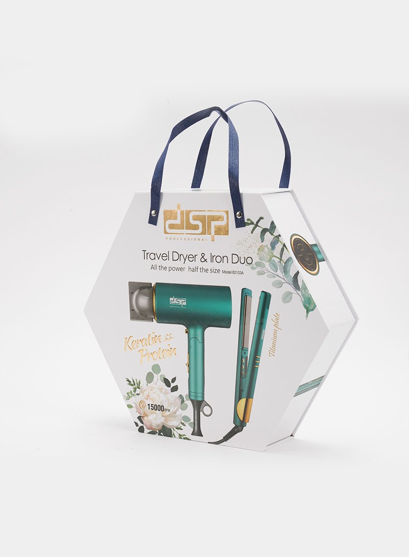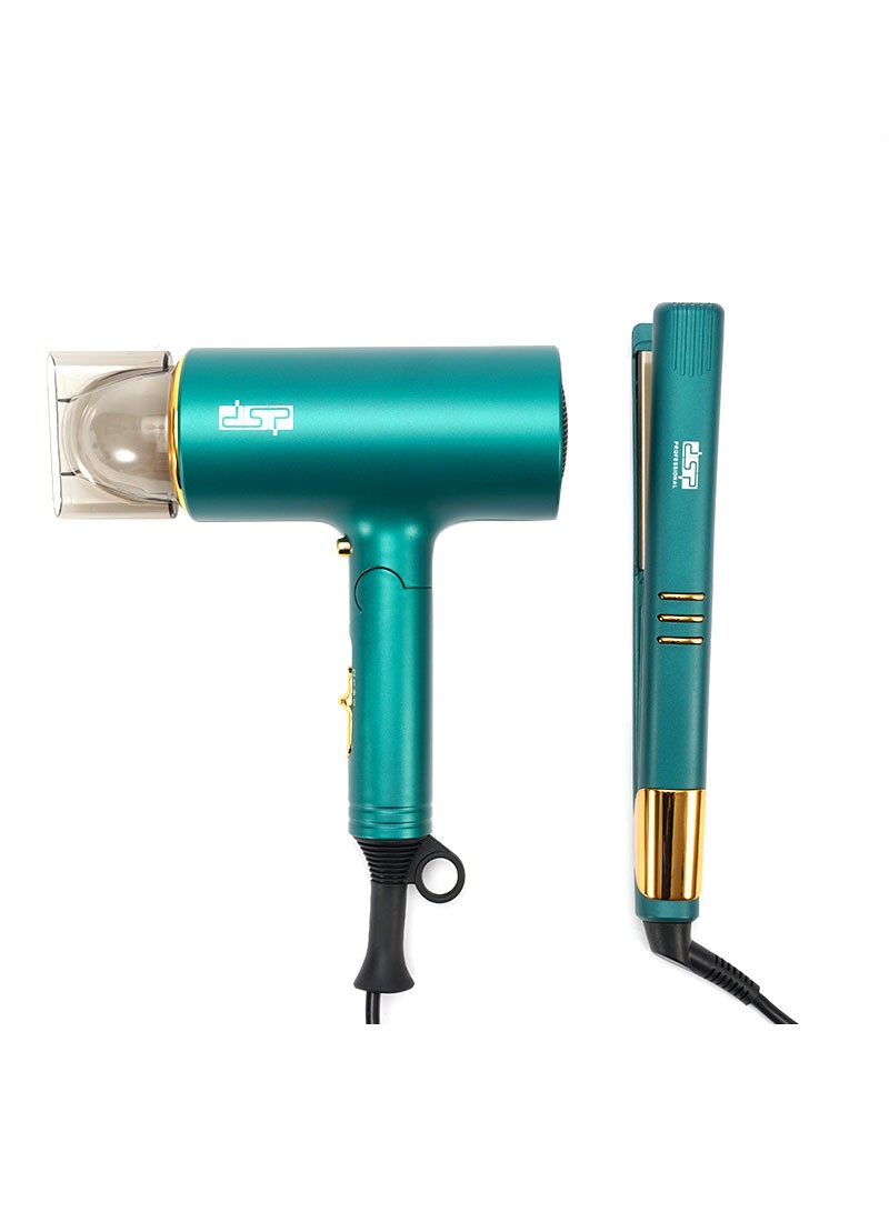 Ensemble duo sèche-cheveux et fer à repasser 2 en 1 1000 W et 38 W 80103A Caractéristiques : Sèche-cheveux avec moteur AC professionnel de 10 000 W. Deux vitesses et trois températures sélectionnables. Un sèche-cheveux garantit un confort d'utilisation maximal. Bouton de soufflage d'air froid pour fixer la coiffure et concentrateur de coiffage, pour un Fer à cheveux avec cordon pivotant à 360° pour une utilisation facile, pli toujours parfait Fer à cheveux réglable à 5 températures à 400°C Max Fer à cheveux équipé d'une plaque en titane extrêmement douce pour lisser rapidement les cheveux d'un seul coup Spécifications du sèche-cheveux : Marque : DSP Modèle : 80103A Puissance : 1000 W Courant : 220-240 V 50/60 Hz Vitesse : 15 000 tr/min Vitesses réglables : 2 options Température réglable : 3 options Fer à cheveux Spécifications : Modèle : 80103A Puissance : 38 W Matériau : plaque de titane ghx1641