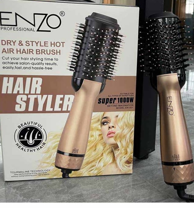 Enzo One Step Styler à air chaud , Ce sèche-cheveux à air chaud est conçu pour sécher et hydrater vos cheveux et réduire le temps de coiffage. La température idéale pour sécher vos cheveux en quelques instants (3-7 minutes). Le revêtement en céramique et le matériau céramique protègent vos cheveux de la casse et assurent une répartition uniforme de la chaleur qui pénètre rapidement dans les cheveux de l'intérieur pour réduire les dommages. Les ions négatifs saturent le flux d'air et agissent pour adoucir les cheveux et réduire les frisottis et les frisottis.