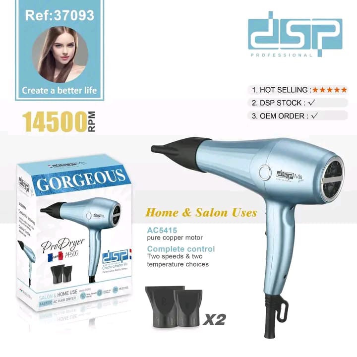 Sèche-cheveux DSP, haute puissance, avec fort débit d'air pour un séchage et un coiffage rapides des cheveux.